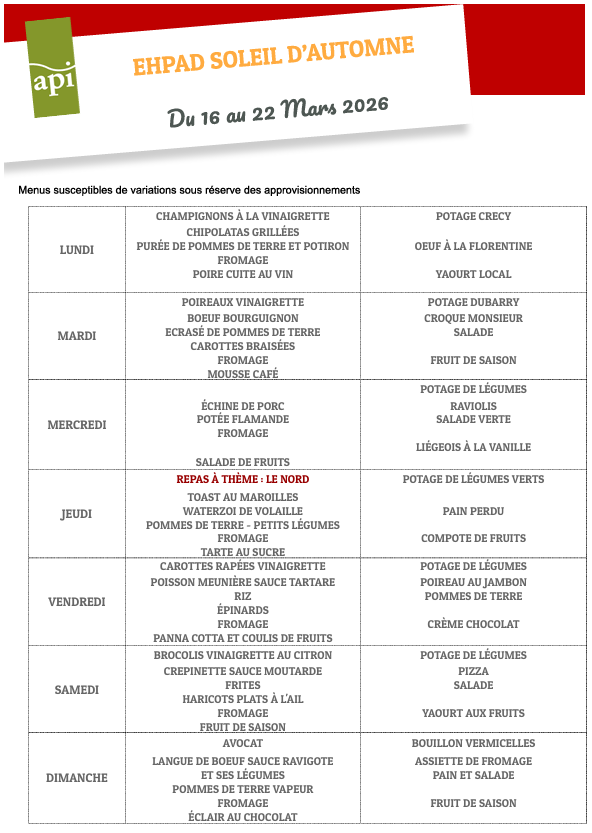 MENUS DU 16 AU 22 MARS 2026