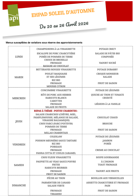 MENUS DU 20 AU 26 AVRIL 2026