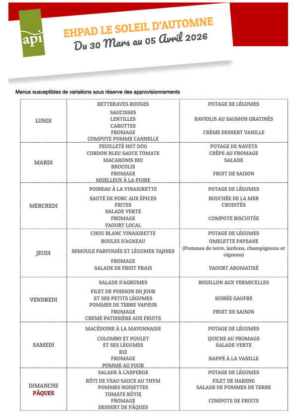 Menus du 30 mars au 5 avril 2026